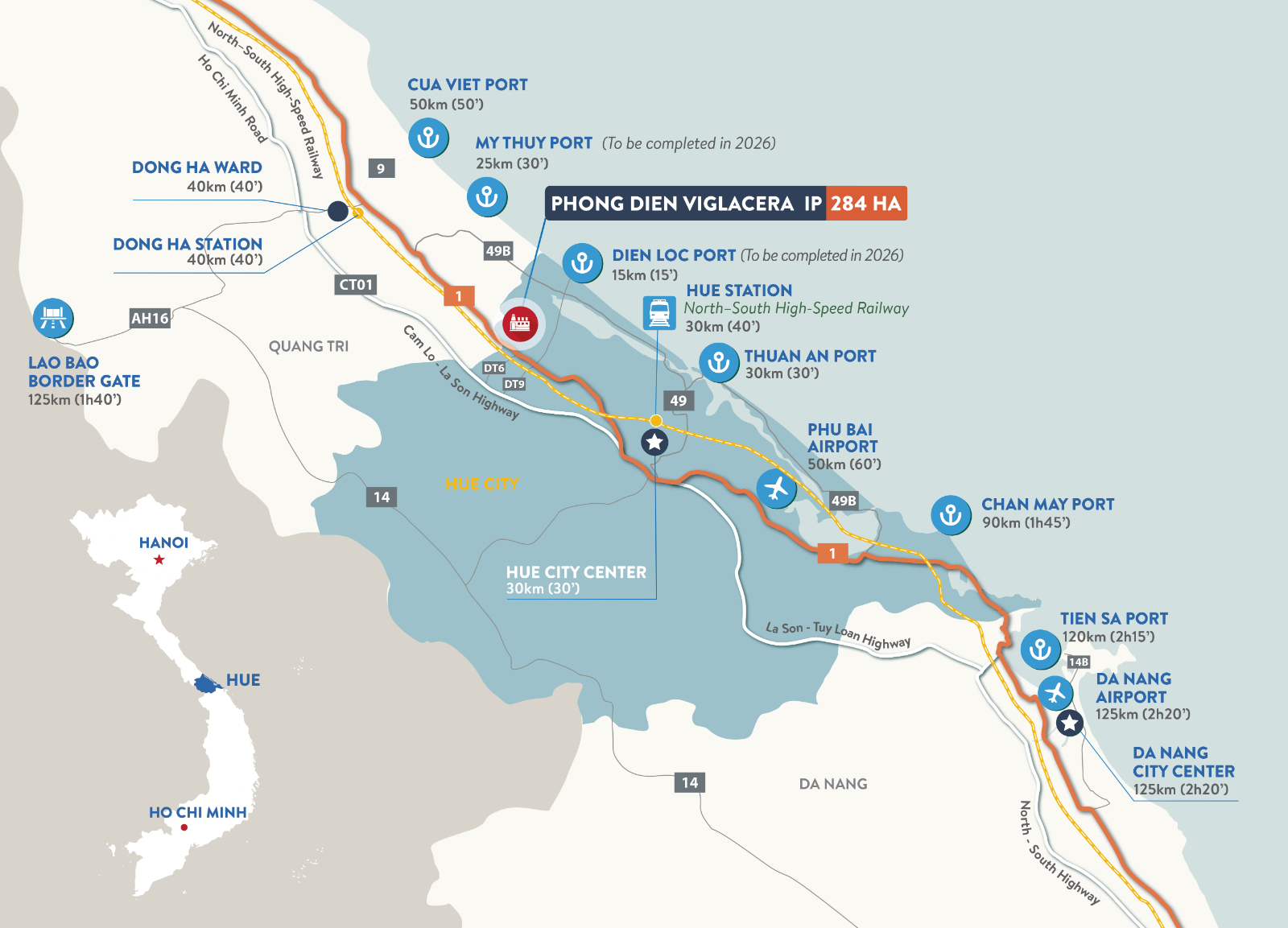 베트남 전국 - 남북 철도선을 연결하는 1A 국도 및 9번 국도와 인접해 있다.