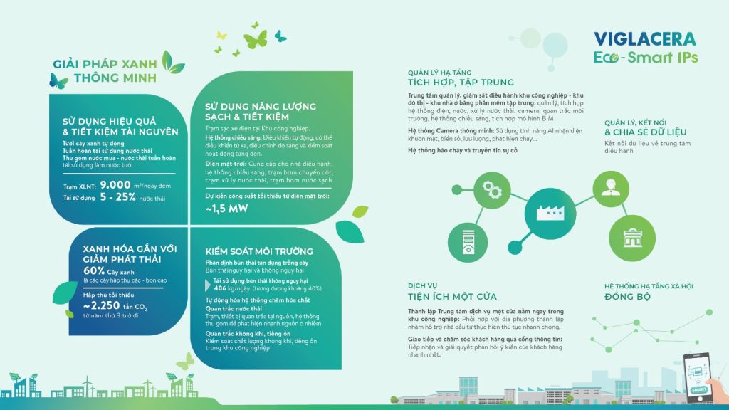 Viglacera cũng quyết tâm từng bước chuyển đổi các KCN mới và KCN hiện có theo những mục tiêu cốt lõi là cắt giảm tối đa tiêu hao nguyên, nhiên liệu vận hành; giảm tiêu thụ nước, sử dụng năng lượng tiết kiệm và hiệu quả; tăng cường sử dụng năng lượng tái tạo; giảm ô nhiễm môi trường, giảm phát thải, qua đó tạo ra lợi ích thiết thực cho các nhà đầu tư thứ cấp…