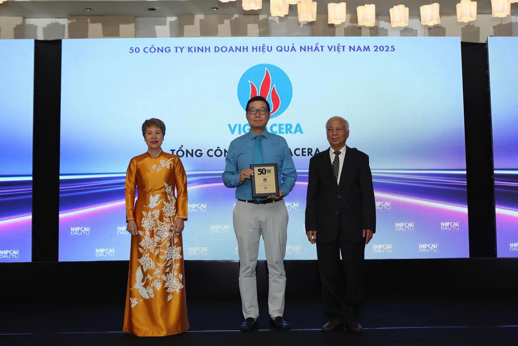 Ông Nguyễn Quốc Huy – Phó Giám đốc Ban Thương mại đại diện cho Tổng công ty Viglacera đón Chứng nhận “Top 50 Công ty kinh doanh hiệu quả nhất Việt Nam năm 2025”