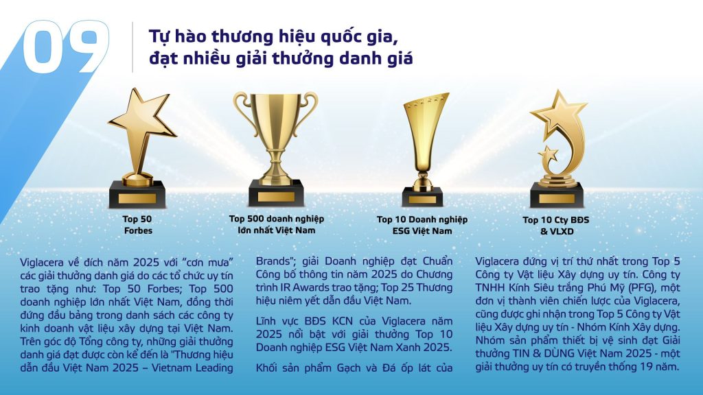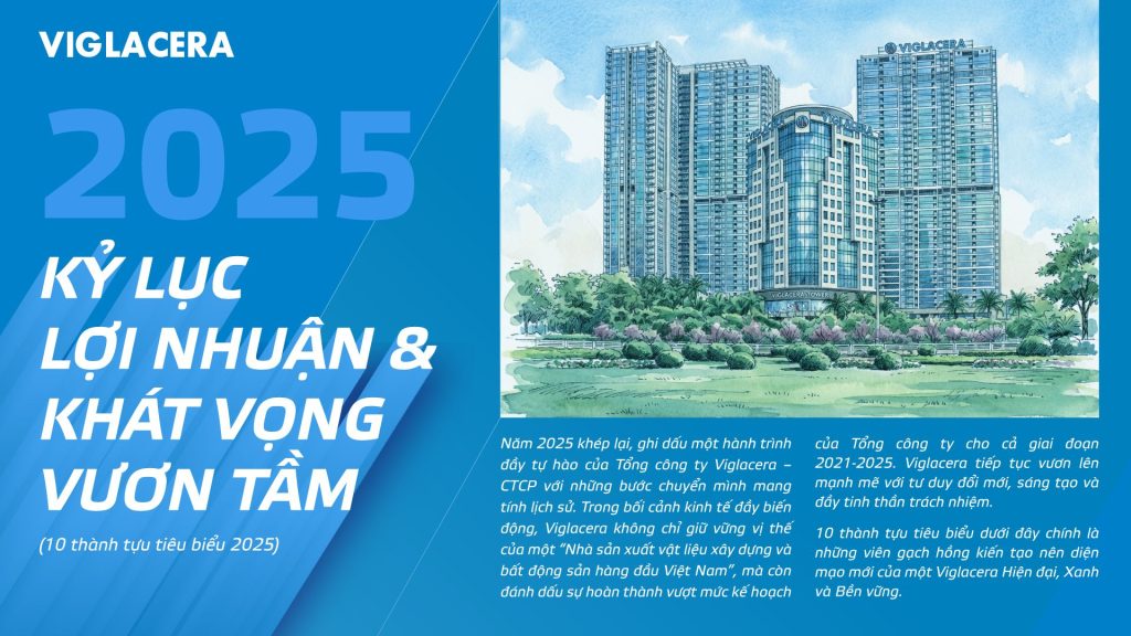 Năm 2025 khép lại, ghi dấu một hành trình đầy tự hào của Tổng công ty Viglacera – CTCP với những bước chuyển mình mang tính lịch sử. Trong bối cảnh kinh tế đầy biến động, Viglacera không chỉ giữ vững vị thế của một “Nhà sản xuất vật liệu xây dựng và bất động sản hàng đầu Việt Nam”, mà còn đánh dấu sự hoàn thành vượt mức kế hoạch của Tổng công ty cho cả giai đoạn 2021 – 2025. Viglacera tiếp tục vươn lên mạnh mẽ với tư duy đổi mới, sáng tạo và tinh thần đầy trách nhiệm. 10 thành tựu tiêu biểu dưới đây chính là những viên gạch hồng kiến tạo nên diện mạo mới của một Viglacera Hiện đại, Xanh và Bền vững.